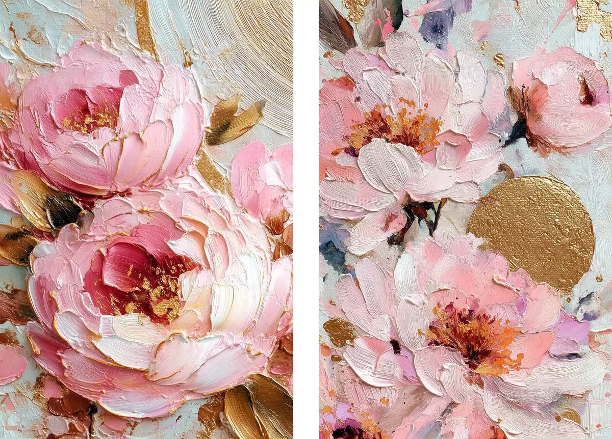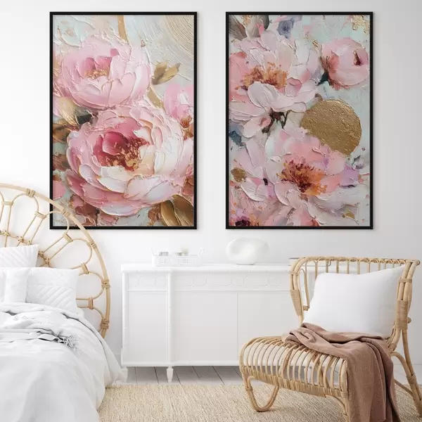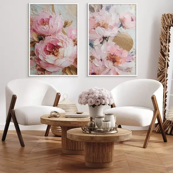 Poster Volumetrisch impasto schilderij met roze pioenrozen en getextureerde details d00573