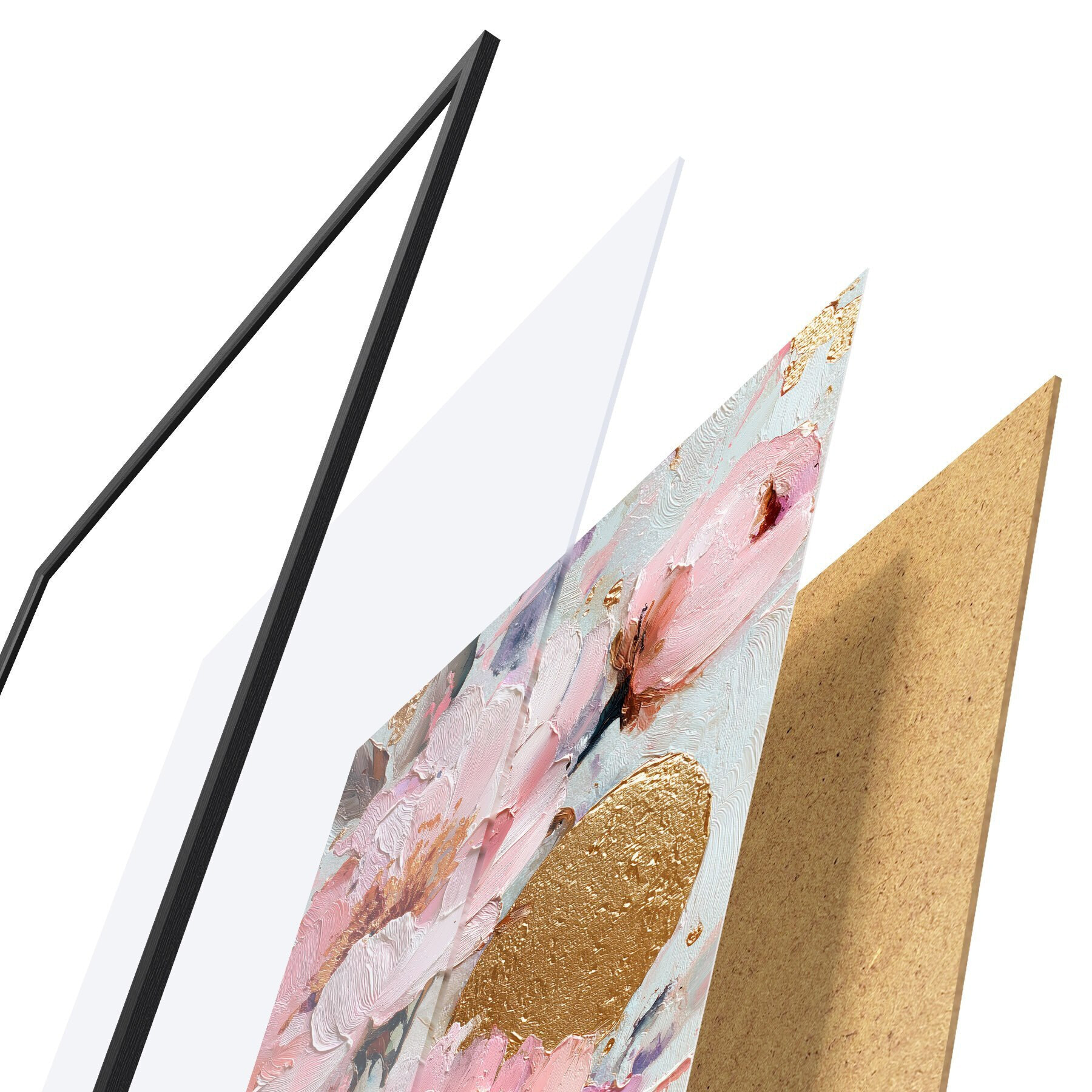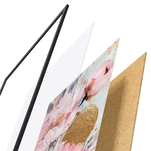 De poster bestaat uit een frame, plexiglas, geprinte afbeelding en spaanplaat achterkant. De poster kan meteen aan de muur worden gehangen dankzij de bevestigingen op de achterkant.