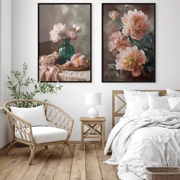 Poster Gepaarde compositie met roze pioenrozen in een vaas en op canvas Nr d00578