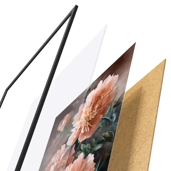 De poster bestaat uit een frame, plexiglas, geprinte afbeelding en spaanplaat achterkant. De poster kan meteen aan de muur worden gehangen dankzij de bevestigingen op de achterkant.