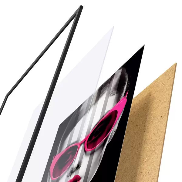 De poster bestaat uit een frame, plexiglas, geprinte afbeelding en spaanplaat achterkant. De poster kan meteen aan de muur worden gehangen dankzij de bevestigingen op de achterkant.