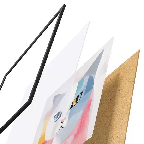 De poster bestaat uit een frame, plexiglas, geprinte afbeelding en spaanplaat achterkant. De poster kan meteen aan de muur worden gehangen dankzij de bevestigingen op de achterkant.
