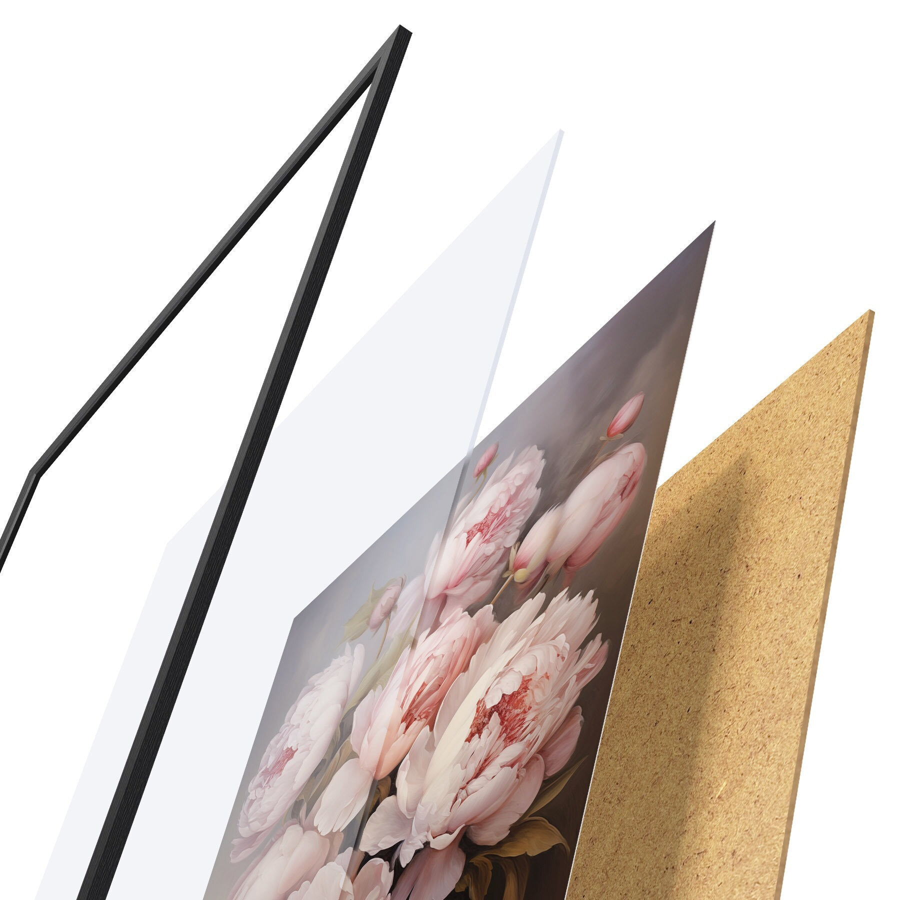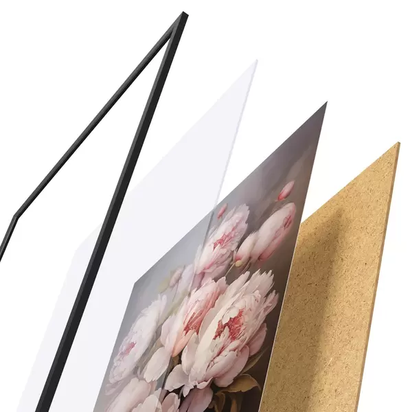 De poster bestaat uit een frame, plexiglas, geprinte afbeelding en spaanplaat achterkant. De poster kan meteen aan de muur worden gehangen dankzij de bevestigingen op de achterkant.