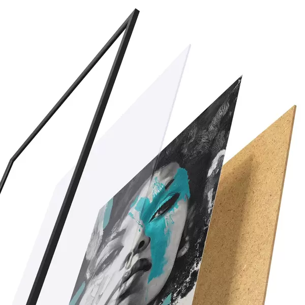 De poster bestaat uit een frame, plexiglas, geprinte afbeelding en spaanplaat achterkant. De poster kan meteen aan de muur worden gehangen dankzij de bevestigingen op de achterkant.