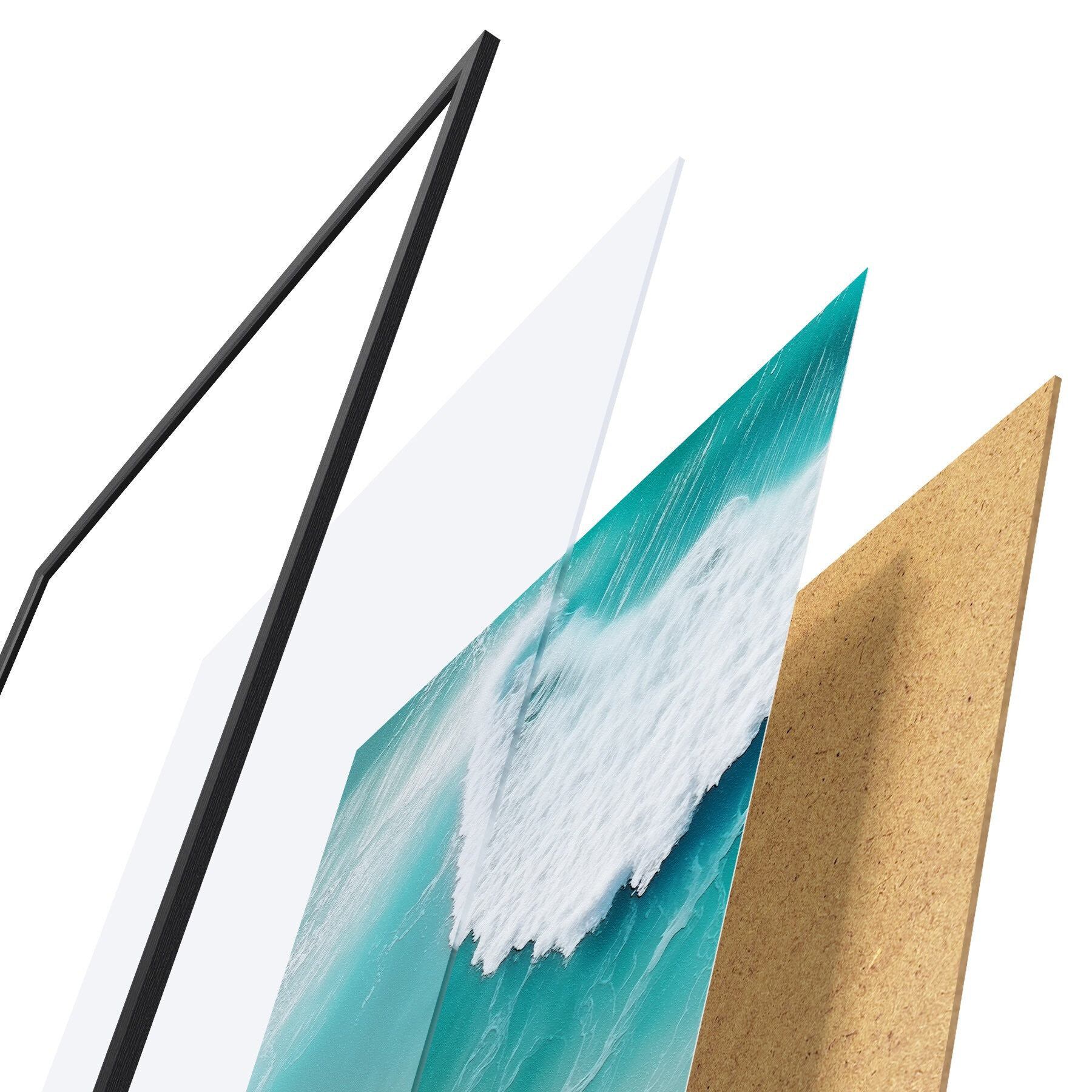 De poster bestaat uit een frame, plexiglas, geprinte afbeelding en spaanplaat achterkant. De poster kan meteen aan de muur worden gehangen dankzij de bevestigingen op de achterkant.