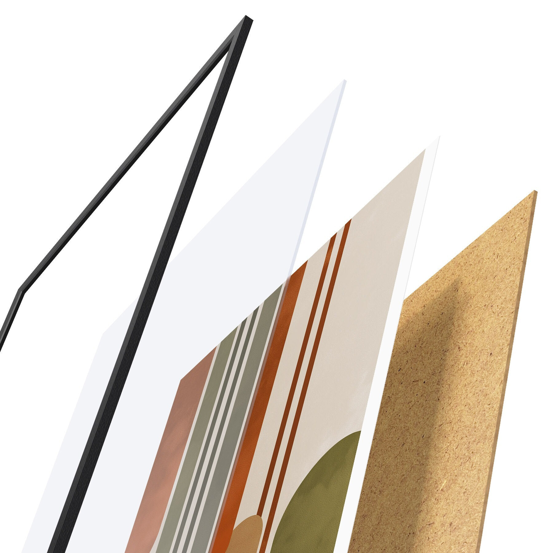 De poster bestaat uit een frame, plexiglas, geprinte afbeelding en spaanplaat achterkant. De poster kan meteen aan de muur worden gehangen dankzij de bevestigingen op de achterkant.