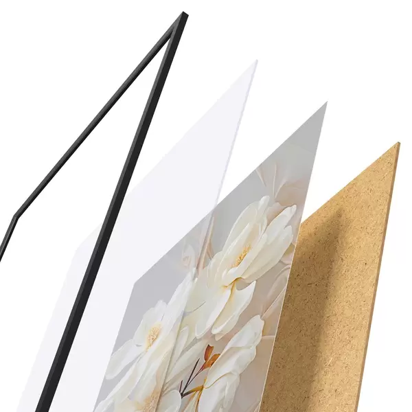 De poster bestaat uit een frame, plexiglas, geprinte afbeelding en spaanplaat achterkant. De poster kan meteen aan de muur worden gehangen dankzij de bevestigingen op de achterkant.