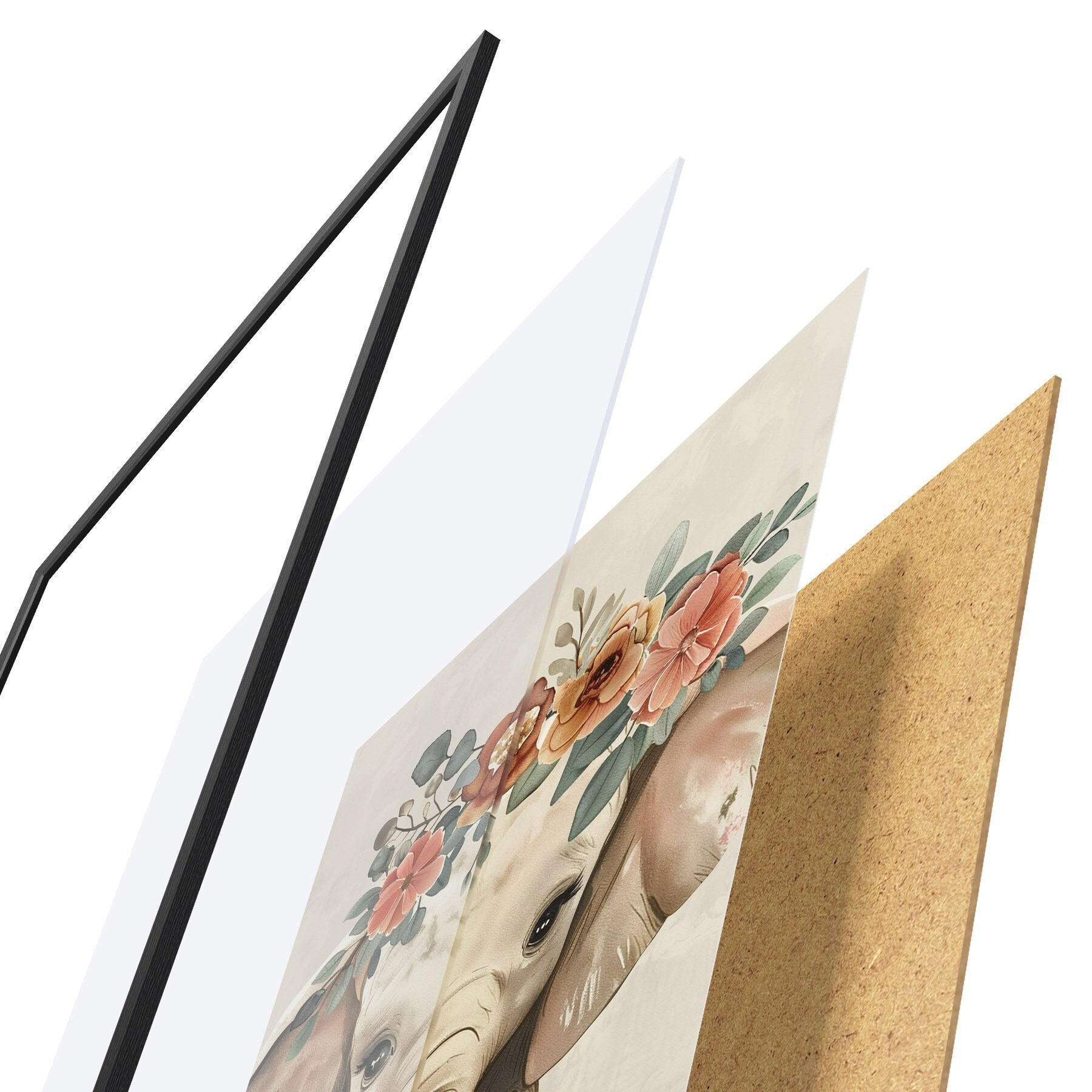 De poster bestaat uit een frame, plexiglas, geprinte afbeelding en spaanplaat achterkant. De poster kan meteen aan de muur worden gehangen dankzij de bevestigingen op de achterkant.