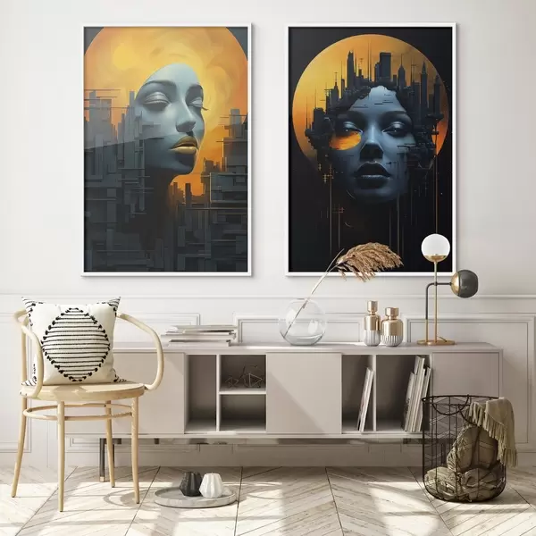 Poster Portret van een meisje op een abstracte stadsachtergrond d00618