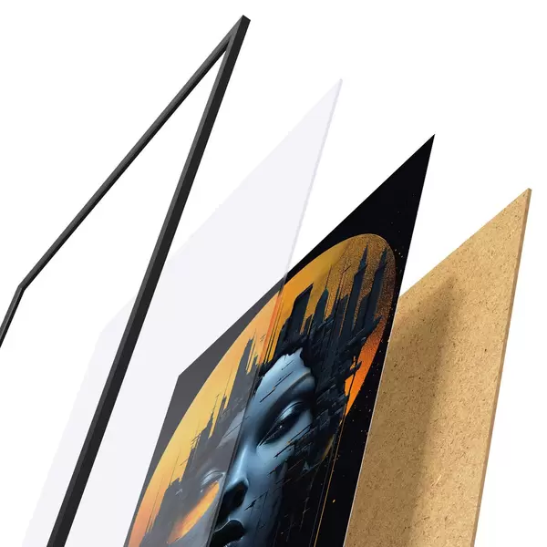 De poster bestaat uit een frame, plexiglas, geprinte afbeelding en spaanplaat achterkant. De poster kan meteen aan de muur worden gehangen dankzij de bevestigingen op de achterkant.