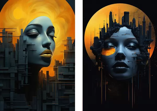 Poster Portret van een meisje op een abstracte stadsachtergrond Nr d00618