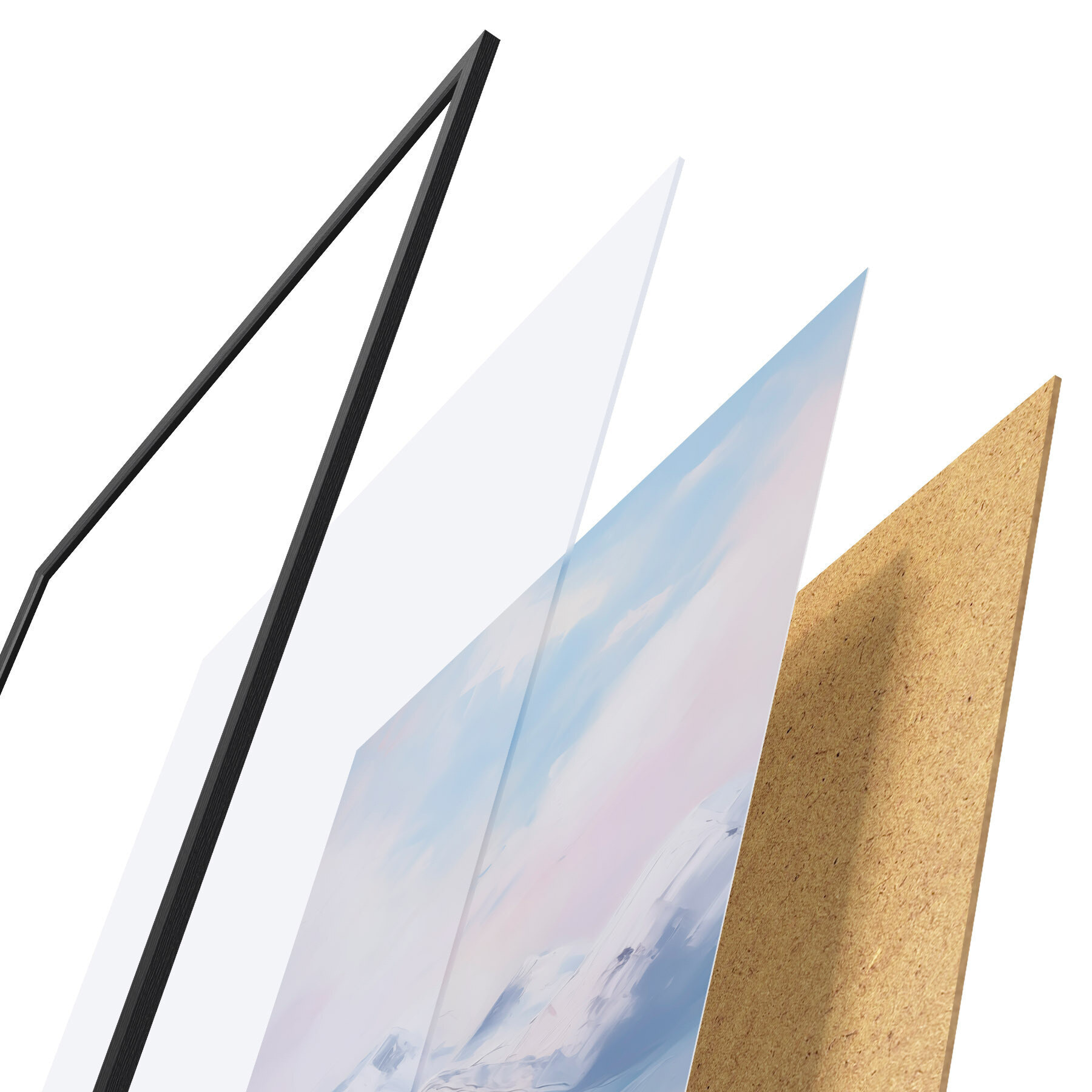 De poster bestaat uit een frame, plexiglas, geprinte afbeelding en spaanplaat achterkant. De poster kan meteen aan de muur worden gehangen dankzij de bevestigingen op de achterkant.
