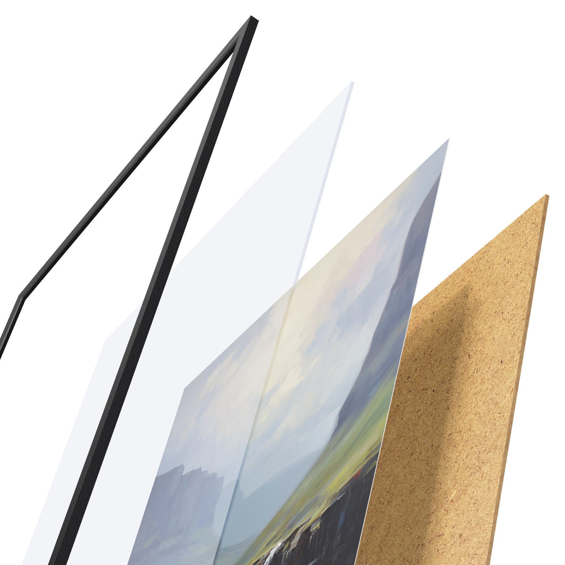 De poster bestaat uit een frame, plexiglas, geprinte afbeelding en spaanplaat achterkant. De poster kan meteen aan de muur worden gehangen dankzij de bevestigingen op de achterkant.