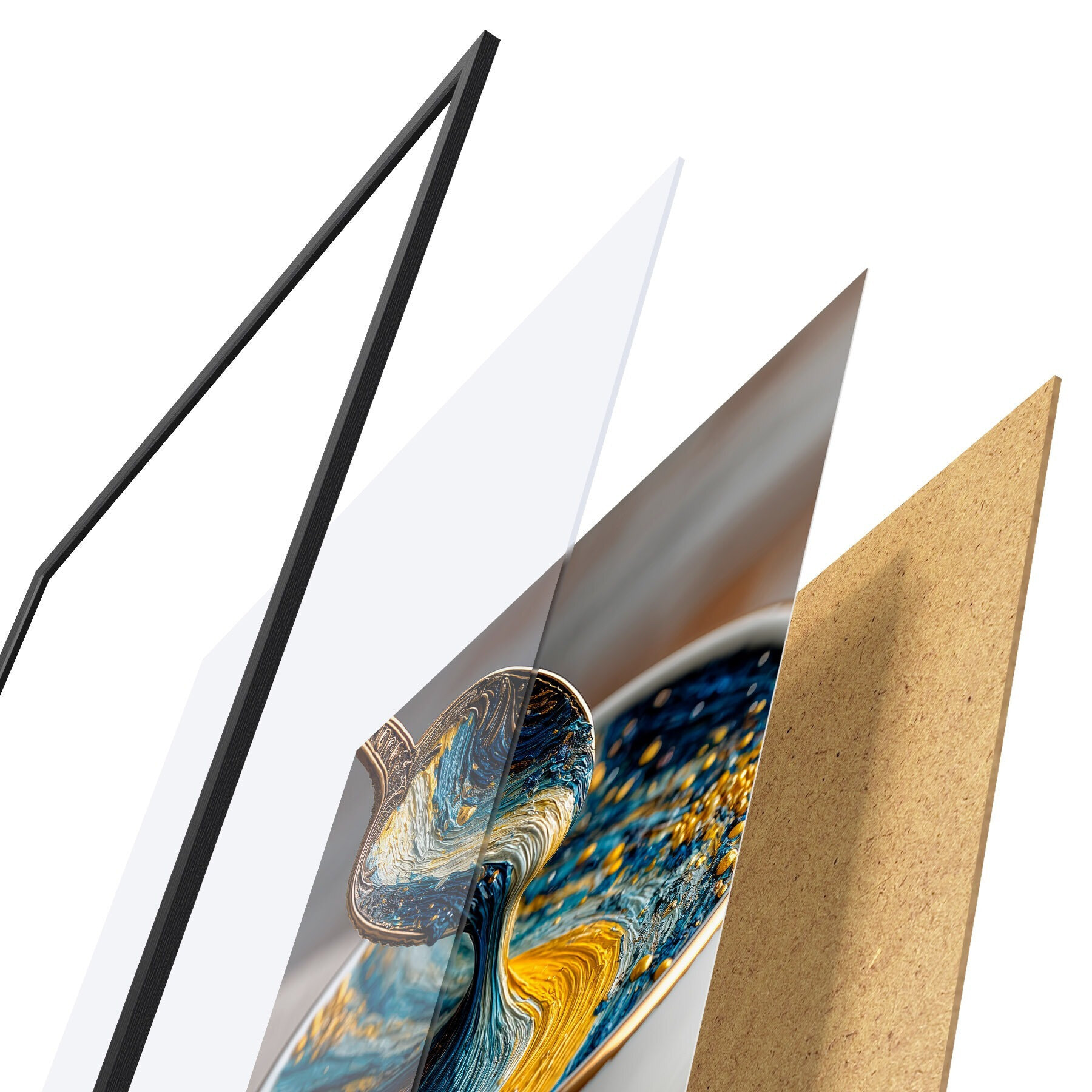 De poster bestaat uit een frame, plexiglas, geprinte afbeelding en spaanplaat achterkant. De poster kan meteen aan de muur worden gehangen dankzij de bevestigingen op de achterkant.