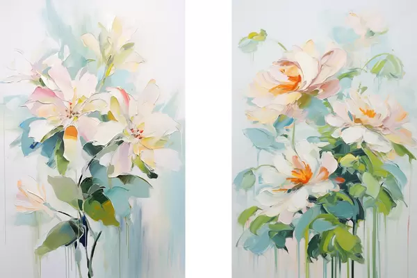 Poster Witte en pastel perzik bloemen, groene bladeren, zachte penseelstreken olieverf imitatie, lichtblauwe achtergrond Nr d00644