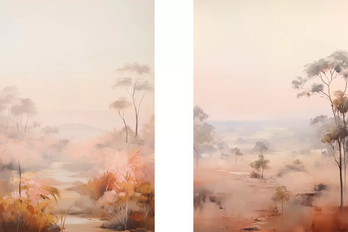 Poster Een landschap met struiken en bomen in roze, oranje en bruine tinten, met bergen op de achtergrond Nr d00646