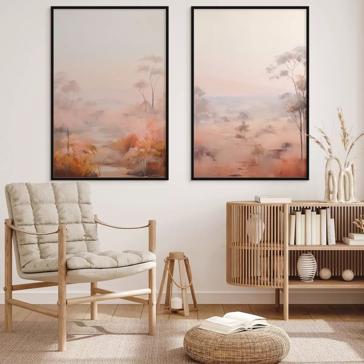 Poster Een landschap met struiken en bomen in roze, oranje en bruine tinten, met bergen op de achtergrond d00646