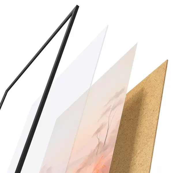 De poster bestaat uit een frame, plexiglas, geprinte afbeelding en spaanplaat achterkant. De poster kan meteen aan de muur worden gehangen dankzij de bevestigingen op de achterkant.