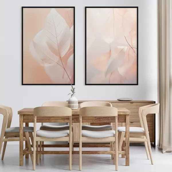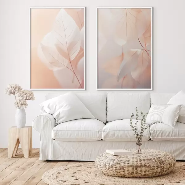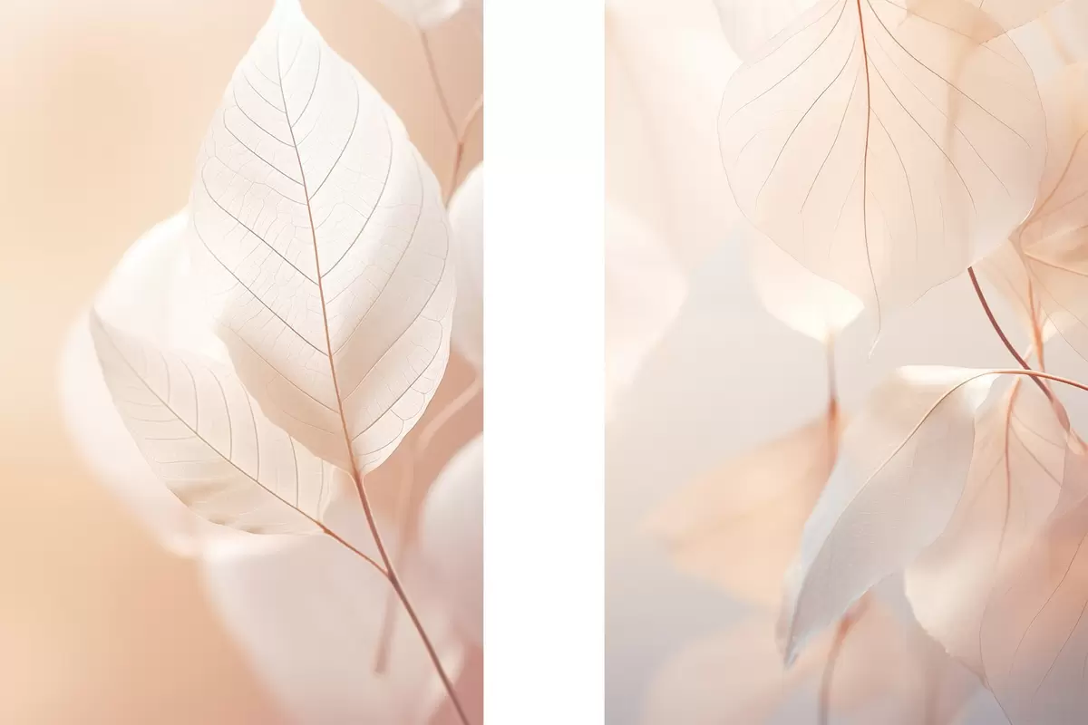 Poster Close-up van doorschijnende bladeren met fijne nerven, zacht perzik en wit kleurenpalet, onscherpe achtergrond Nr d00647