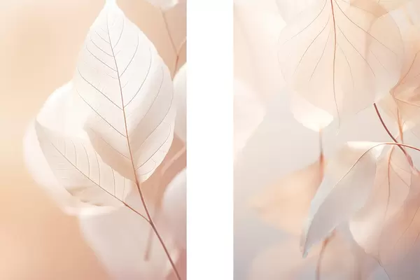 Poster Close-up van doorschijnende bladeren met fijne nerven, zacht perzik en wit kleurenpalet, onscherpe achtergrond d00647