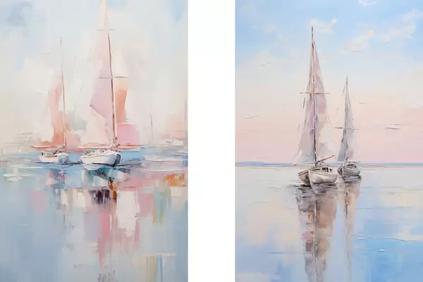 Poster Zeilboten met roze zeilen drijvend op een kalme zee, reflecties van de boten in het water, zachte pastelkleuren Nr d00648
