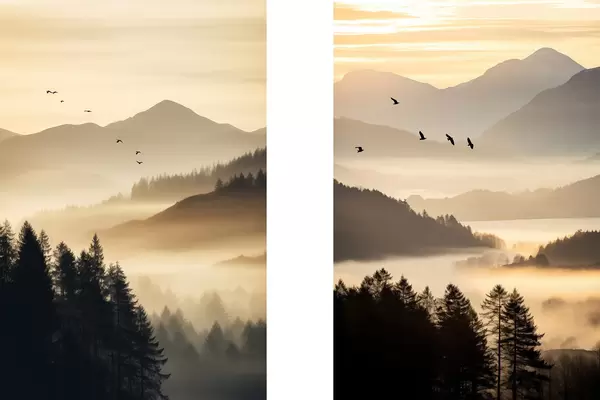 Poster Een berglandschap met een bos en vogels die in de lucht vliegen, alles bedekt met een dikke laag mist tijdens zonsopgang Nr d00651
