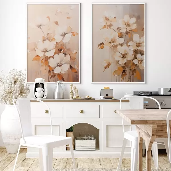 Poster Witte bloemen met oranje bladeren, fijne penseelstreken, warm kleurenpalet, elegante compositie Nr d00656