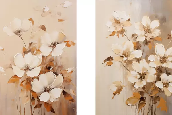 Poster Witte bloemen met oranje bladeren, fijne penseelstreken, warm kleurenpalet, elegante compositie Nr d00656