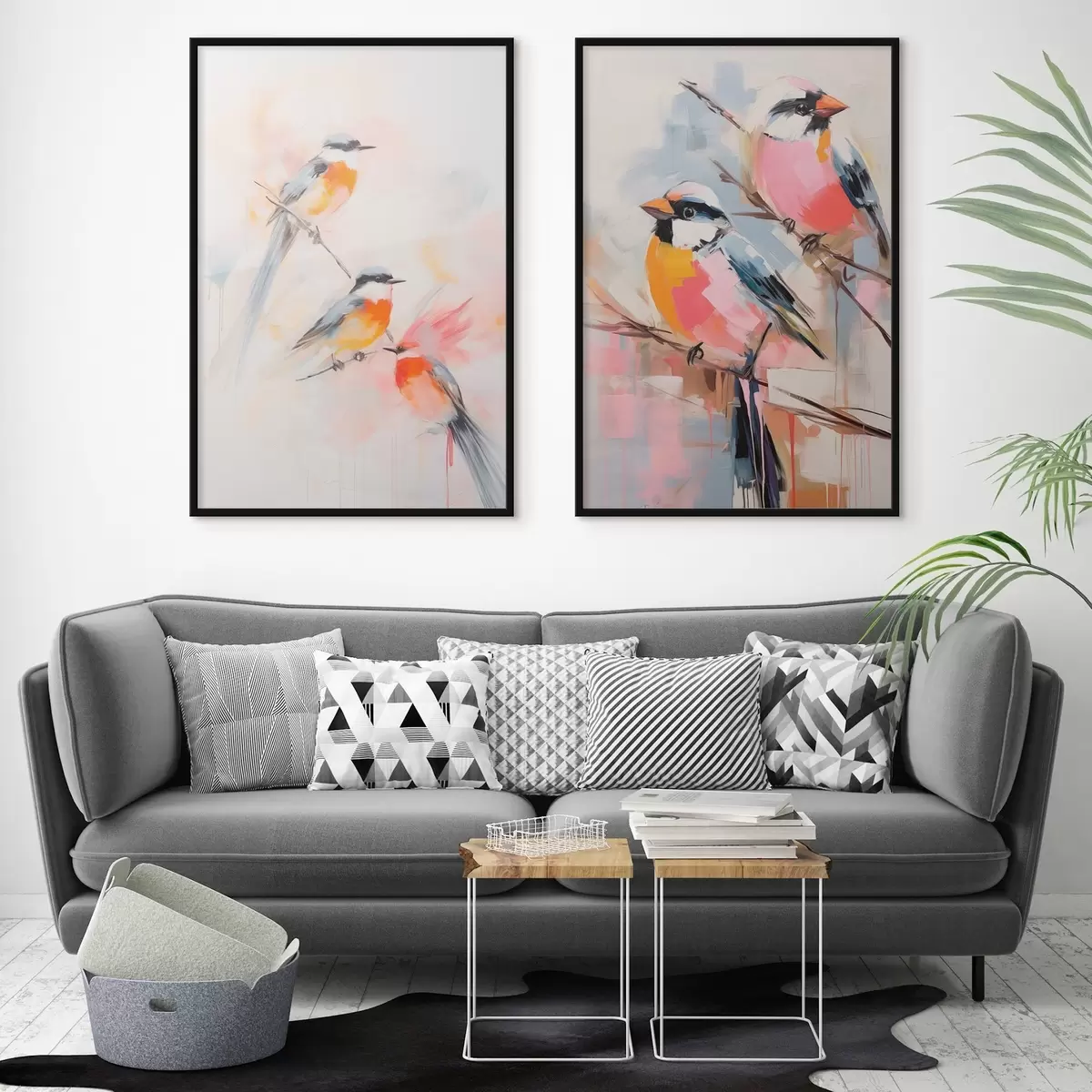 Poster Vogels neergestreken op takken , zachte pastelkleuren, lichte achtergrond met roze en witte tinten Nr d00658
