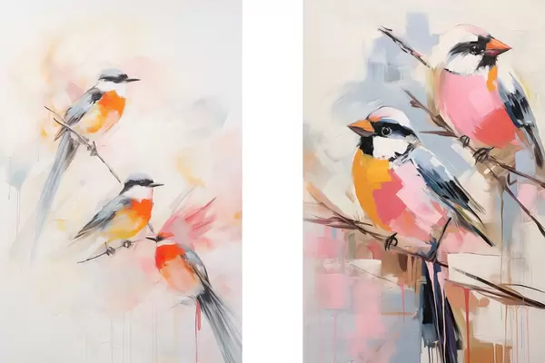 Poster Vogels neergestreken op takken , zachte pastelkleuren, lichte achtergrond met roze en witte tinten Nr d00658