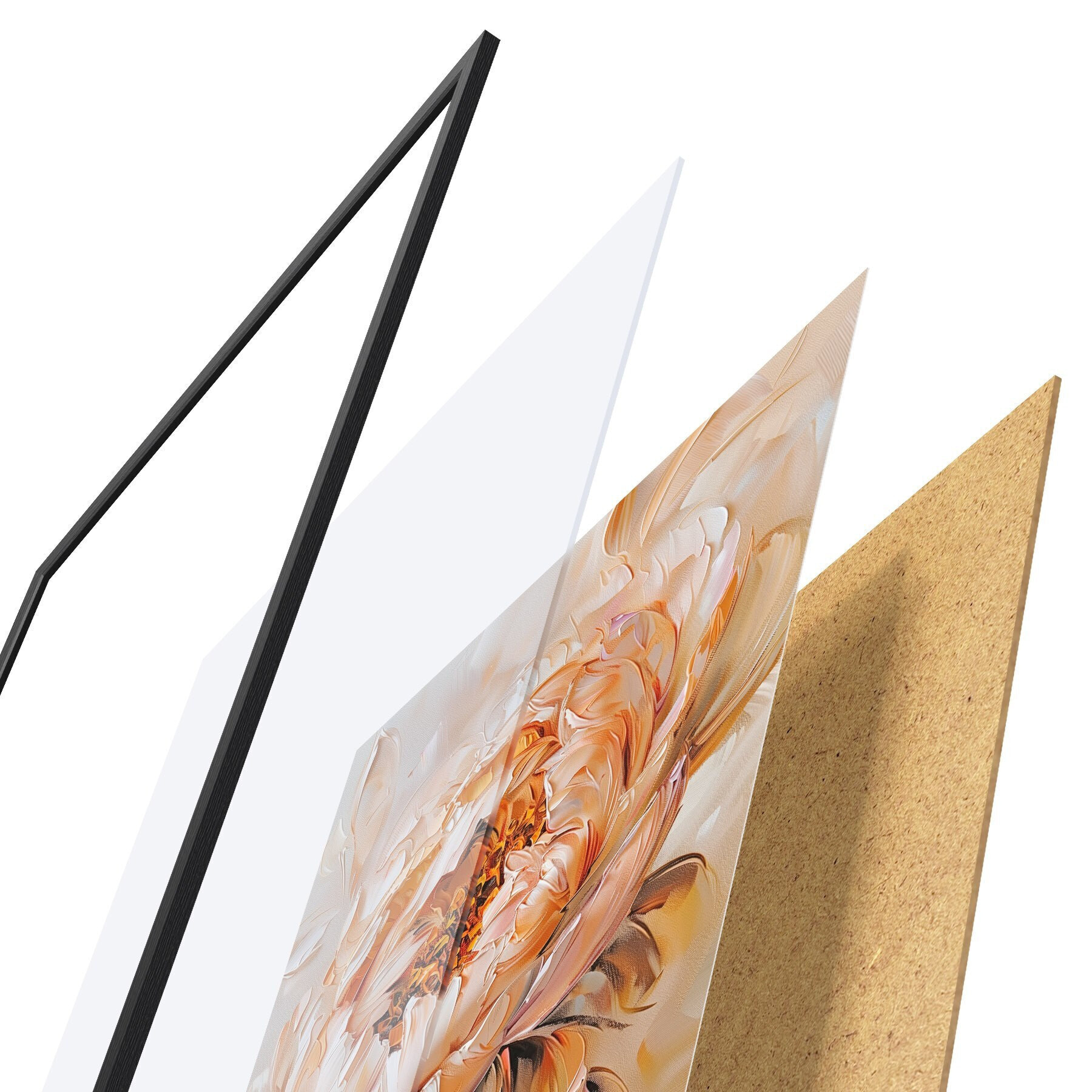 De poster bestaat uit een frame, plexiglas, geprinte afbeelding en spaanplaat achterkant. De poster kan meteen aan de muur worden gehangen dankzij de bevestigingen op de achterkant.