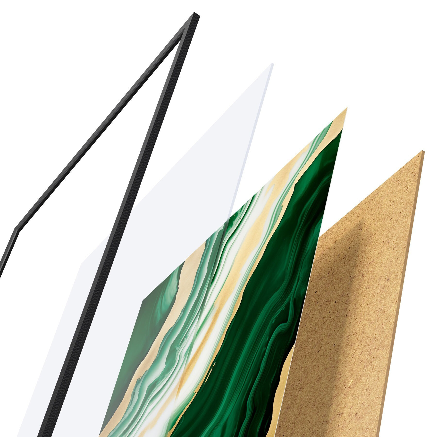 De poster bestaat uit een frame, plexiglas, geprinte afbeelding en spaanplaat achterkant. De poster kan meteen aan de muur worden gehangen dankzij de bevestigingen op de achterkant.