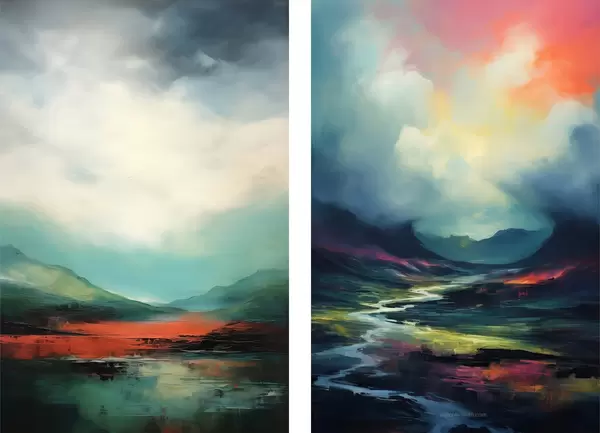 Poster Abstract landschap met wolken in turquoise en rode tinten Nr d00691