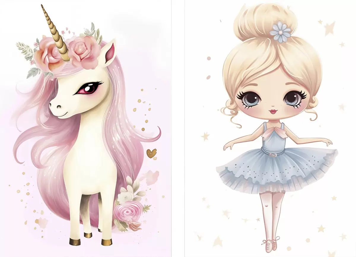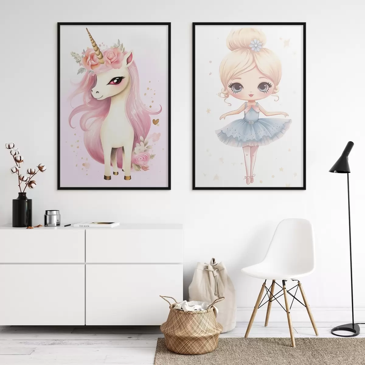 Poster Ballerina pop in een blauwe jurk en eenhoorn met roze manen Nr d00692
