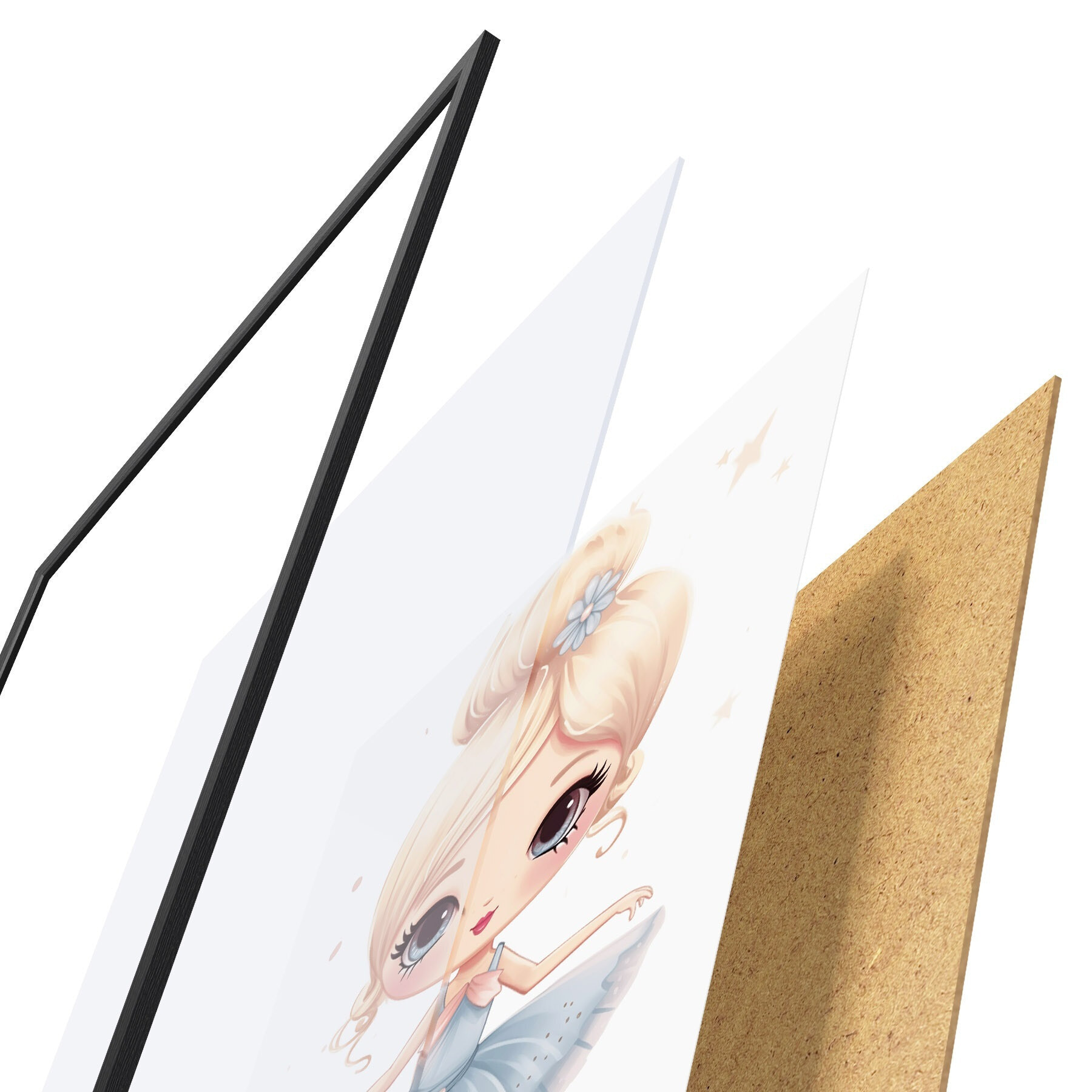 De poster bestaat uit een frame, plexiglas, geprinte afbeelding en spaanplaat achterkant. De poster kan meteen aan de muur worden gehangen dankzij de bevestigingen op de achterkant.