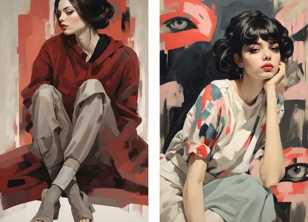Poster Portretten van meisjes in rood en beige abstracte stijlen Nr d00695