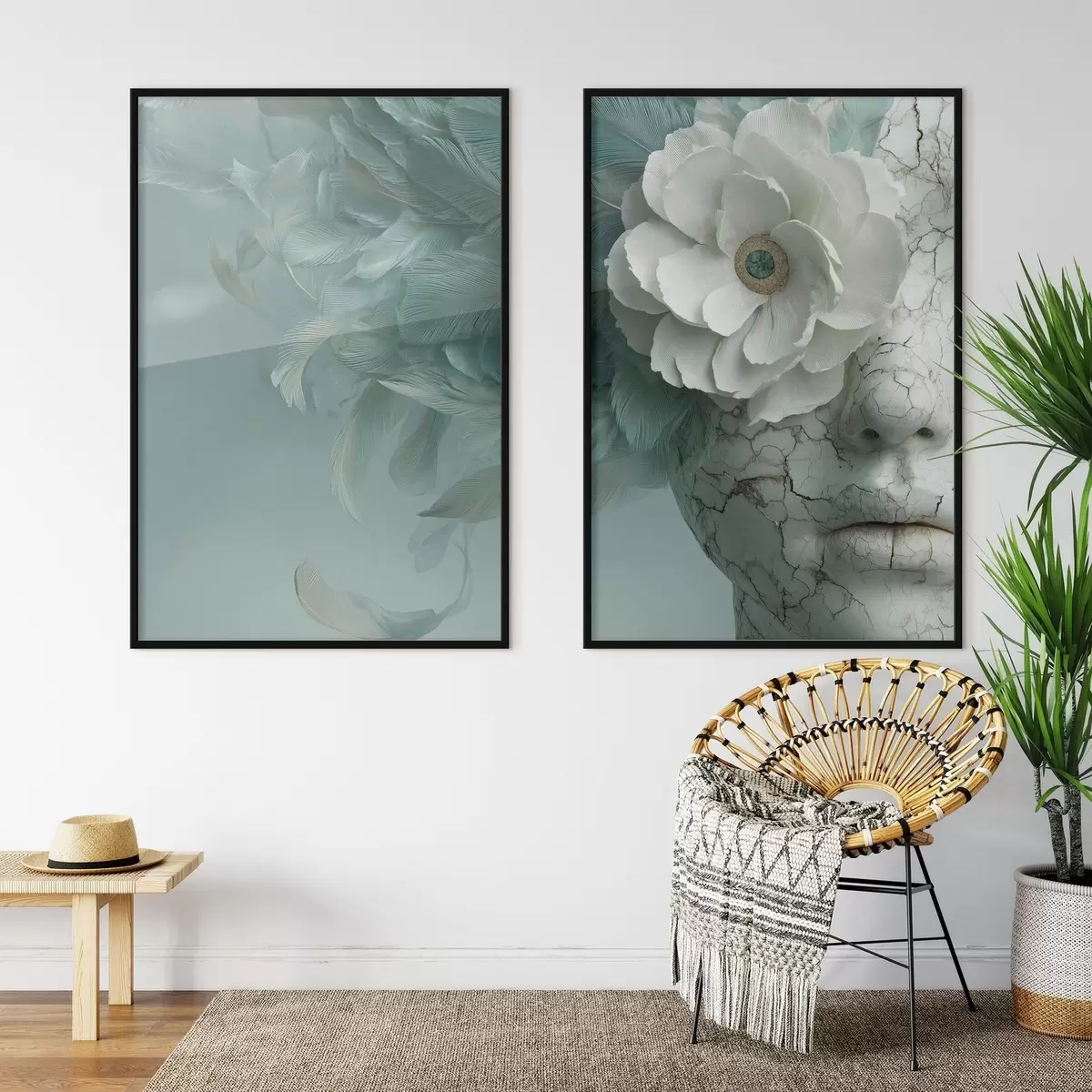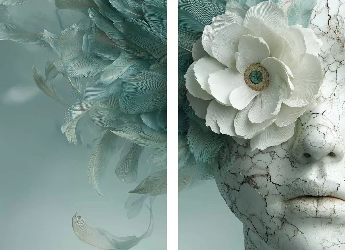 Poster marmeren gezicht van een meisje met een bloem en veren Nr d00699