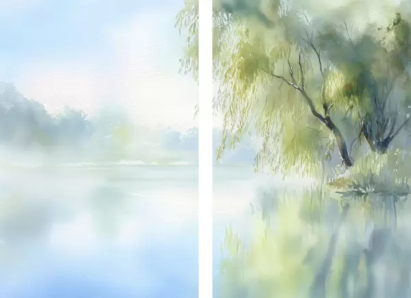 Poster wilgenboom aan de oever van het meer in aquarelstijl Nr d00702