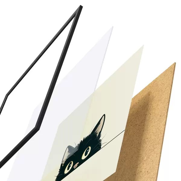 De poster bestaat uit een frame, plexiglas, geprinte afbeelding en spaanplaat achterkant. De poster kan meteen aan de muur worden gehangen dankzij de bevestigingen op de achterkant.