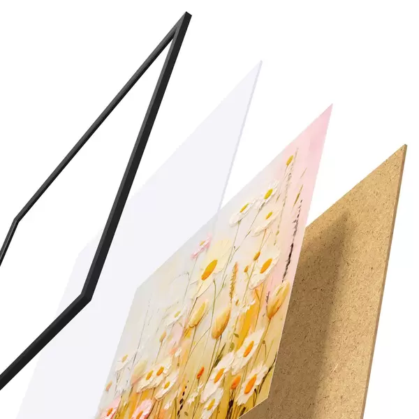 De poster bestaat uit een frame, plexiglas, geprinte afbeelding en spaanplaat achterkant. De poster kan meteen aan de muur worden gehangen dankzij de bevestigingen op de achterkant.