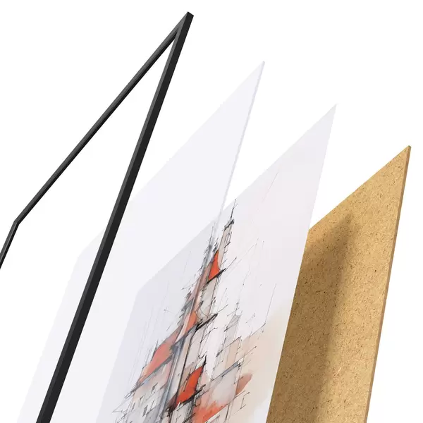 De poster bestaat uit een frame, plexiglas, geprinte afbeelding en spaanplaat achterkant. De poster kan meteen aan de muur worden gehangen dankzij de bevestigingen op de achterkant.