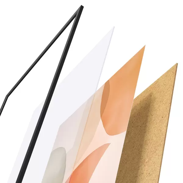 De poster bestaat uit een frame, plexiglas, geprinte afbeelding en spaanplaat achterkant. De poster kan meteen aan de muur worden gehangen dankzij de bevestigingen op de achterkant.