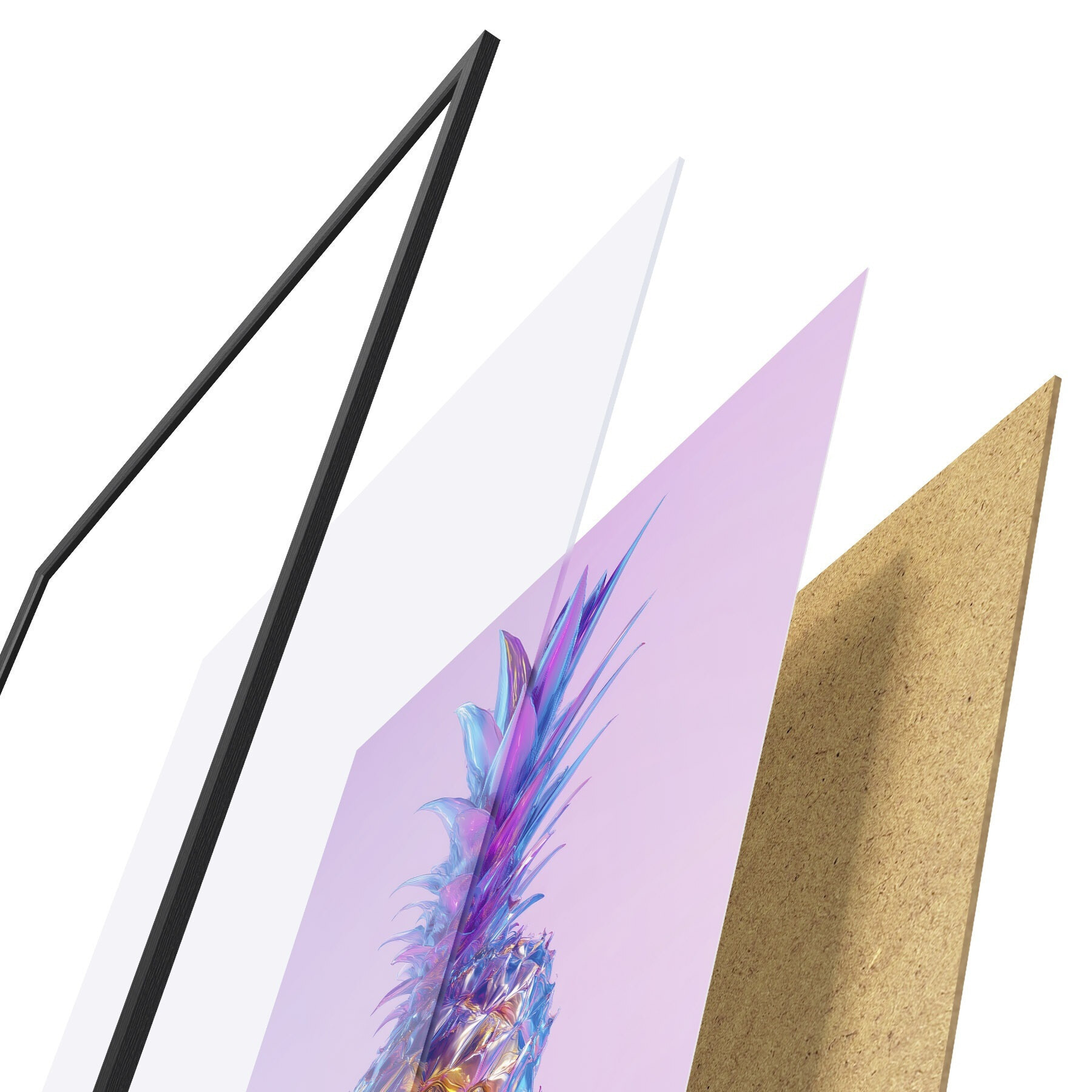 De poster bestaat uit een frame, plexiglas, geprinte afbeelding en spaanplaat achterkant. De poster kan meteen aan de muur worden gehangen dankzij de bevestigingen op de achterkant.