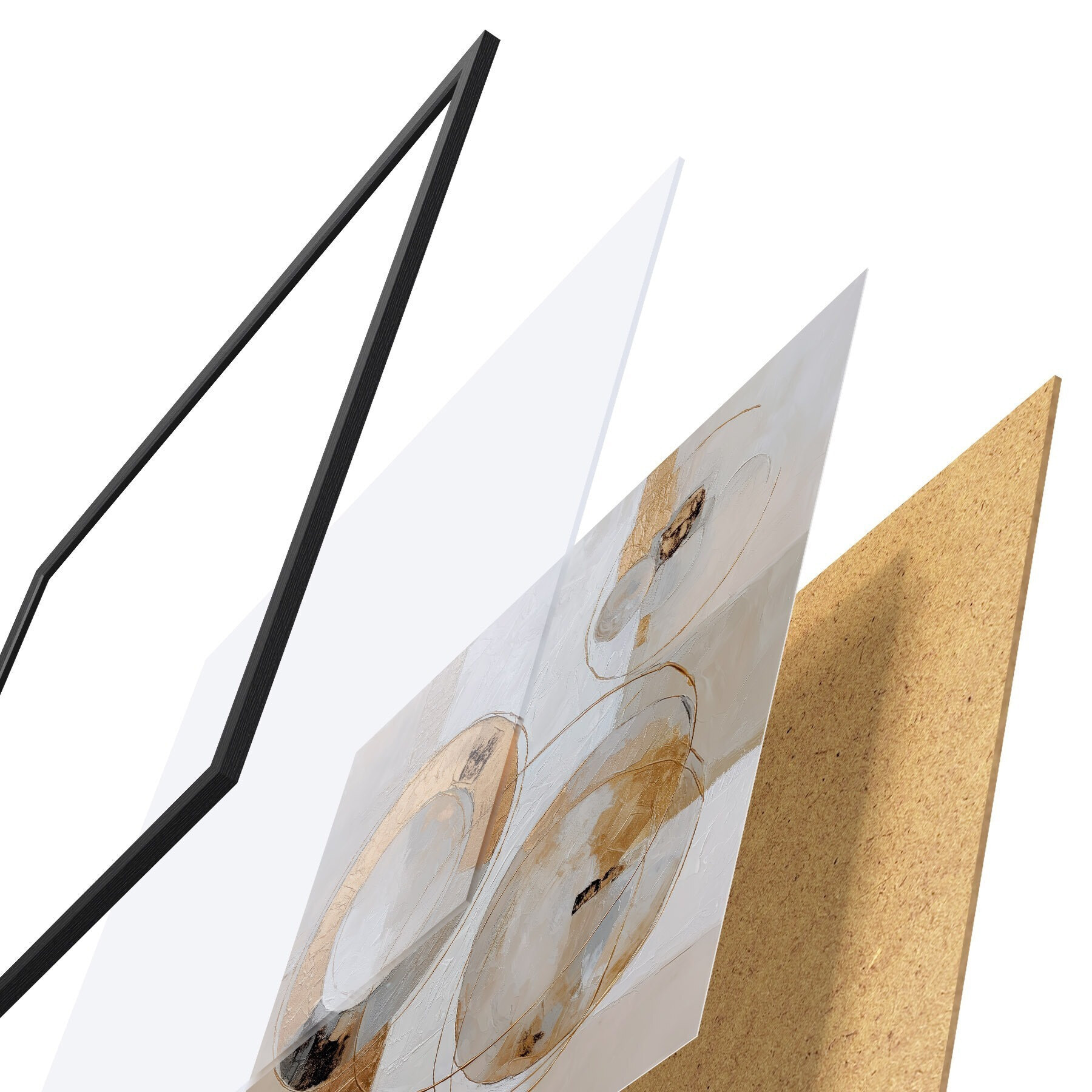 De poster bestaat uit een frame, plexiglas, geprinte afbeelding en spaanplaat achterkant. De poster kan meteen aan de muur worden gehangen dankzij de bevestigingen op de achterkant.