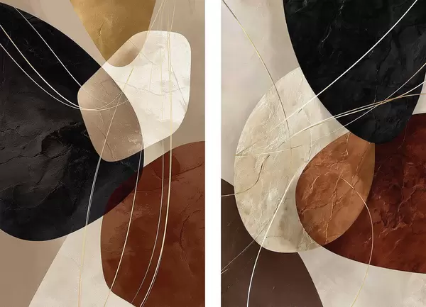 Poster Geometrische ovalen in een warm kleurenpalet met gele lijnen Nr d00763