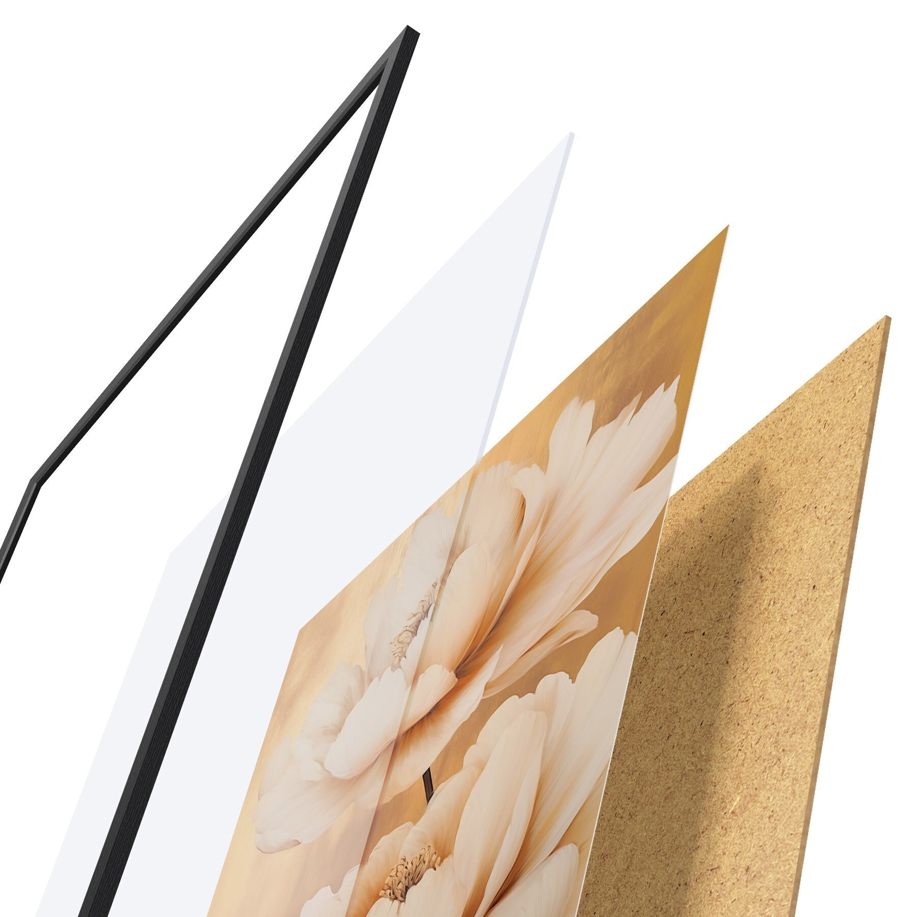 De poster bestaat uit een frame, plexiglas, geprinte afbeelding en spaanplaat achterkant. De poster kan meteen aan de muur worden gehangen dankzij de bevestigingen op de achterkant.