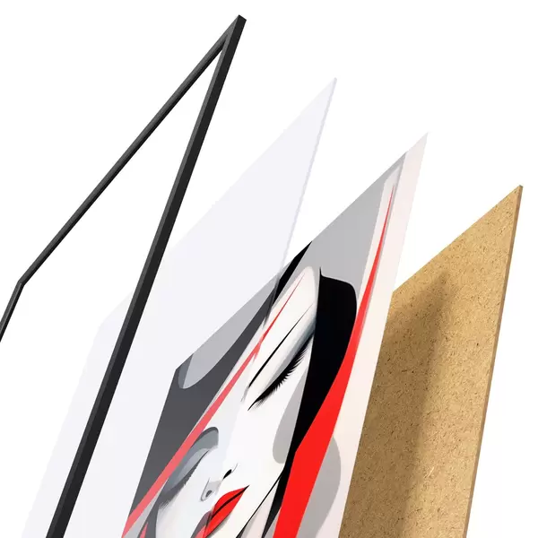 De poster bestaat uit een frame, plexiglas, geprinte afbeelding en spaanplaat achterkant. De poster kan meteen aan de muur worden gehangen dankzij de bevestigingen op de achterkant.