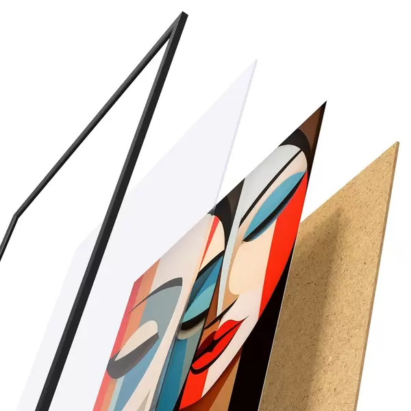 De poster bestaat uit een frame, plexiglas, geprinte afbeelding en spaanplaat achterkant. De poster kan meteen aan de muur worden gehangen dankzij de bevestigingen op de achterkant.