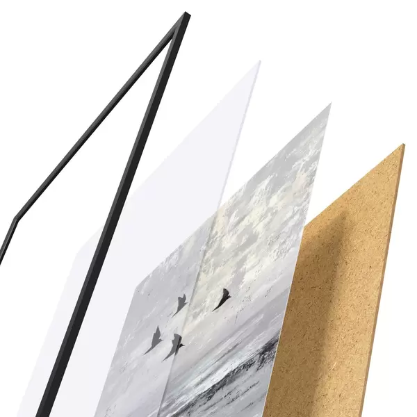 De poster bestaat uit een frame, plexiglas, geprinte afbeelding en spaanplaat achterkant. De poster kan meteen aan de muur worden gehangen dankzij de bevestigingen op de achterkant.