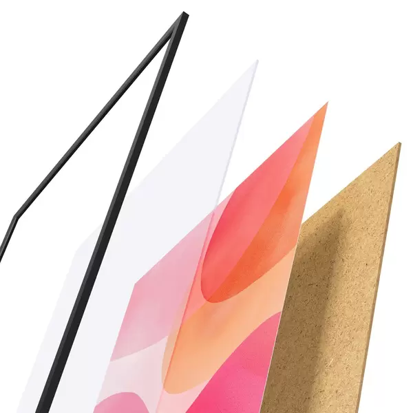 De poster bestaat uit een frame, plexiglas, geprinte afbeelding en spaanplaat achterkant. De poster kan meteen aan de muur worden gehangen dankzij de bevestigingen op de achterkant.
